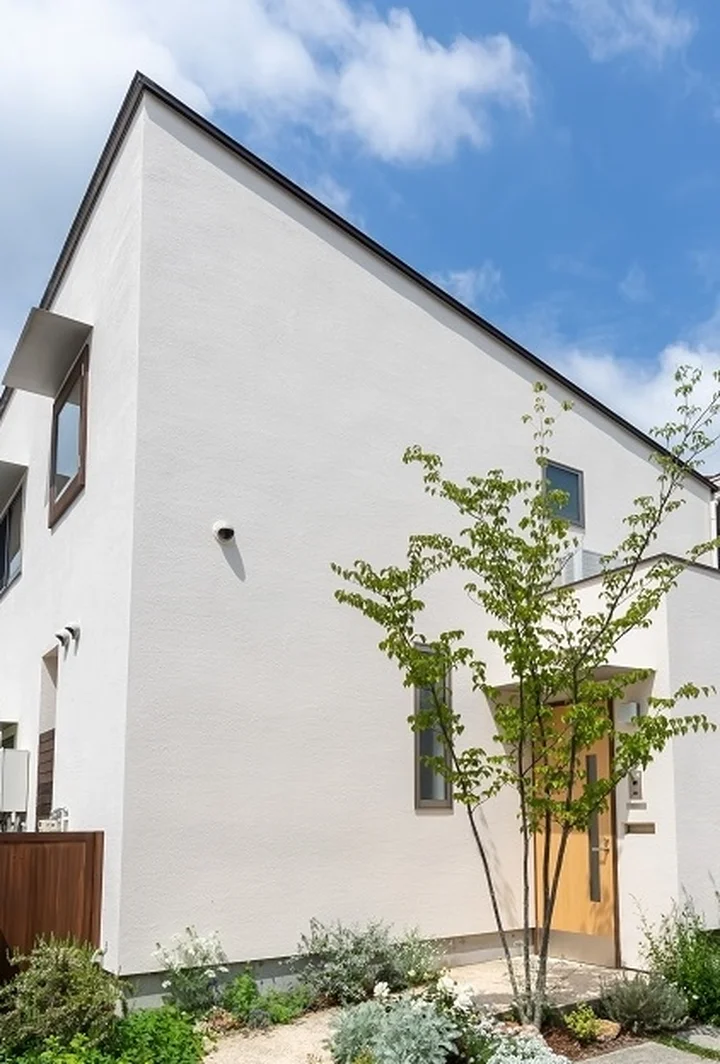 - その駐車場に面した白壁の一戸建てが RAINBOW ORB です