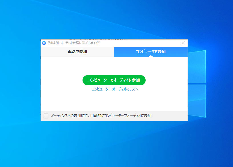4)パソコンがマイクやスピーカーを認識すると表示される画面の、「コンピューターでオーディオに参加」をクリックして下さい。